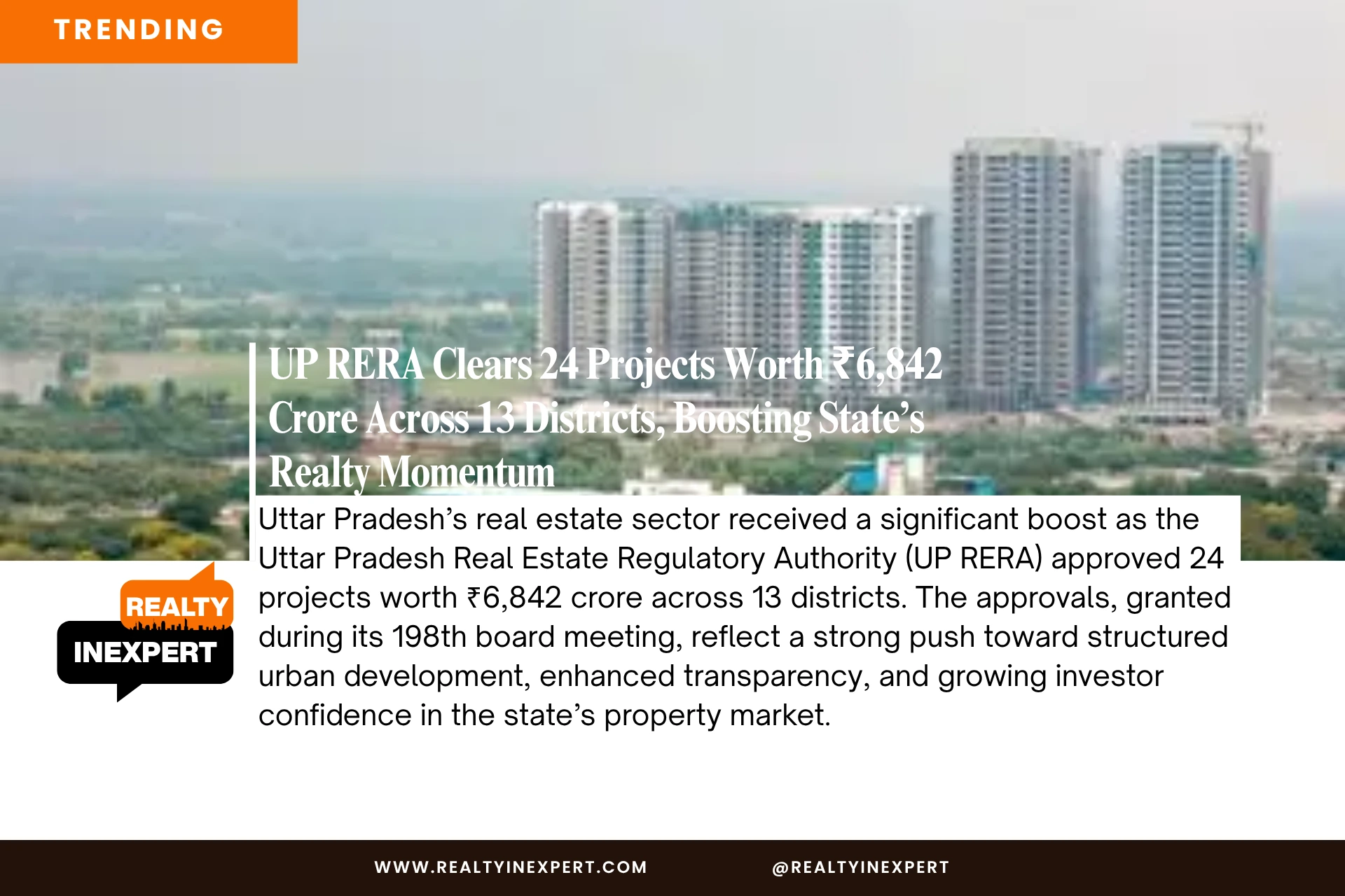 Uttar Pradesh’s real estate sector received a significant boost as the Uttar Pradesh Real Estate Regulatory Authority (UP RERA) approved 24 projects worth ₹6,842 crore across 13 districts. The approvals, granted during its 198th board meeting, reflect a strong push toward structured urban development, enhanced transparency, and growing investor confidence in the state’s property market.