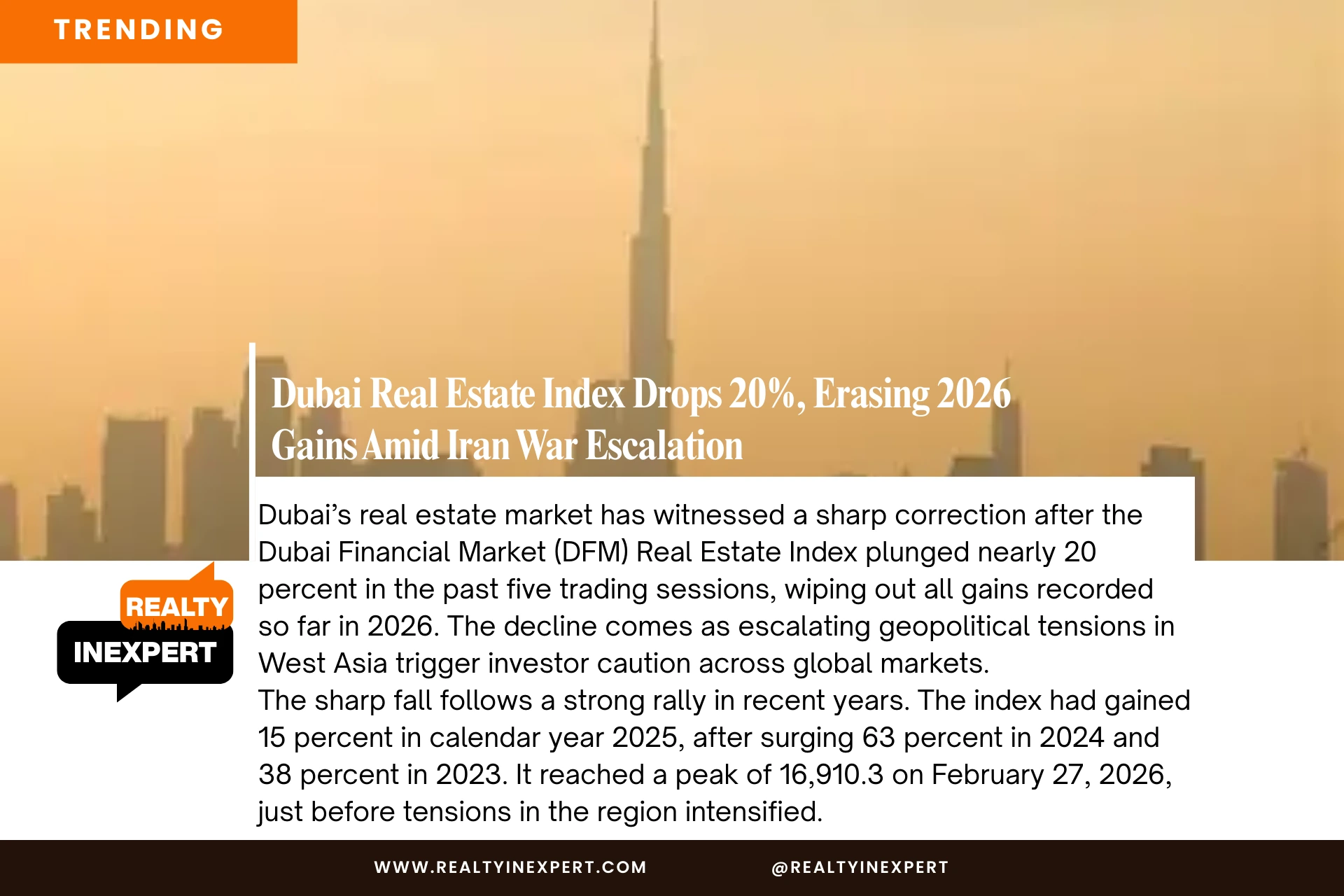 Dubai’s real estate market has witnessed a sharp correction after the Dubai Financial Market (DFM) Real Estate Index plunged nearly 20 percent in the past five trading sessions, wiping out all gains recorded so far in 2026. The decline comes as escalating geopolitical tensions in West Asia trigger investor caution across global markets.